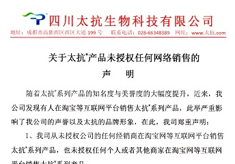 關于太抗?產品未授權任何網絡銷售的聲明發布日期:2017.05.15點擊量:6723 -
