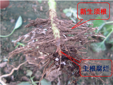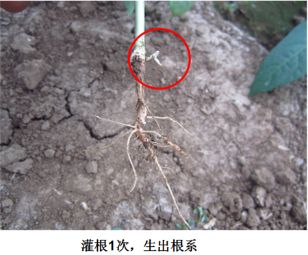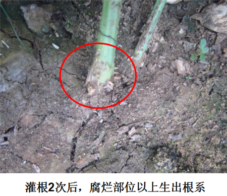 試驗結(jié)果:根腐發(fā)病部位上方長出新根,植株恢復(fù)健康生長。