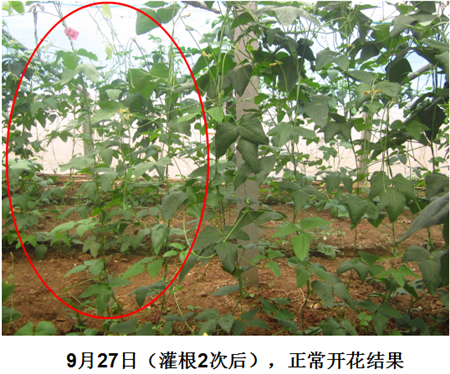 試驗結(jié)果:連續(xù)使用2次之后,發(fā)病的豆角開始正常的生長開花結(jié)莢