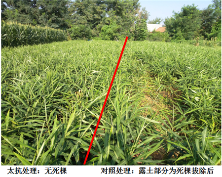 試驗結(jié)果:整個生育期使用3遍“枯木逢春”組合之后,大姜的死棵得到很好的控制,防效達(dá)到90%以上;