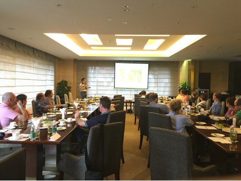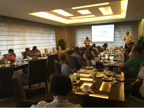 會(huì)上,董事長(zhǎng)黃永博士詳細(xì)講解了太抗系列產(chǎn)品的作用機(jī)理及各地應(yīng)用案列,得到了所有與會(huì)人員的高度關(guān)注。當(dāng)講到太抗產(chǎn)品的安全性時(shí),外賓們紛紛將在燒杯中的樣品看了又看,聞了又聞,可能實(shí)在覺得看似酸奶的生物農(nóng)藥著實(shí)稀奇。PPT放映結(jié)束后,外賓們接連提問,關(guān)于產(chǎn)品的保質(zhì)期、使用技術(shù)、投入產(chǎn)出比等等,董事長(zhǎng)一一解答,連喝水的空都沒有。其中,來自來自維多利亞州的Gary Jeans講到其種植有4000公頃有機(jī)李用于出口中國(guó),非常希望能用上太抗系列產(chǎn)品!此外,有外賓提出想帶些樣品回澳洲,也有外賓提出想和我公司澳洲研發(fā)人員深入交流,更有外賓要了黃董厚厚一疊名片說是要去澳洲幫我們做宣傳!