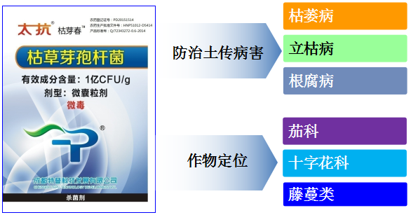 特點:我國唯一正式登記為微膠囊劑的生物殺菌劑,重點用于土傳病害防治,尤其是對枯萎病防治,促進根系生長;